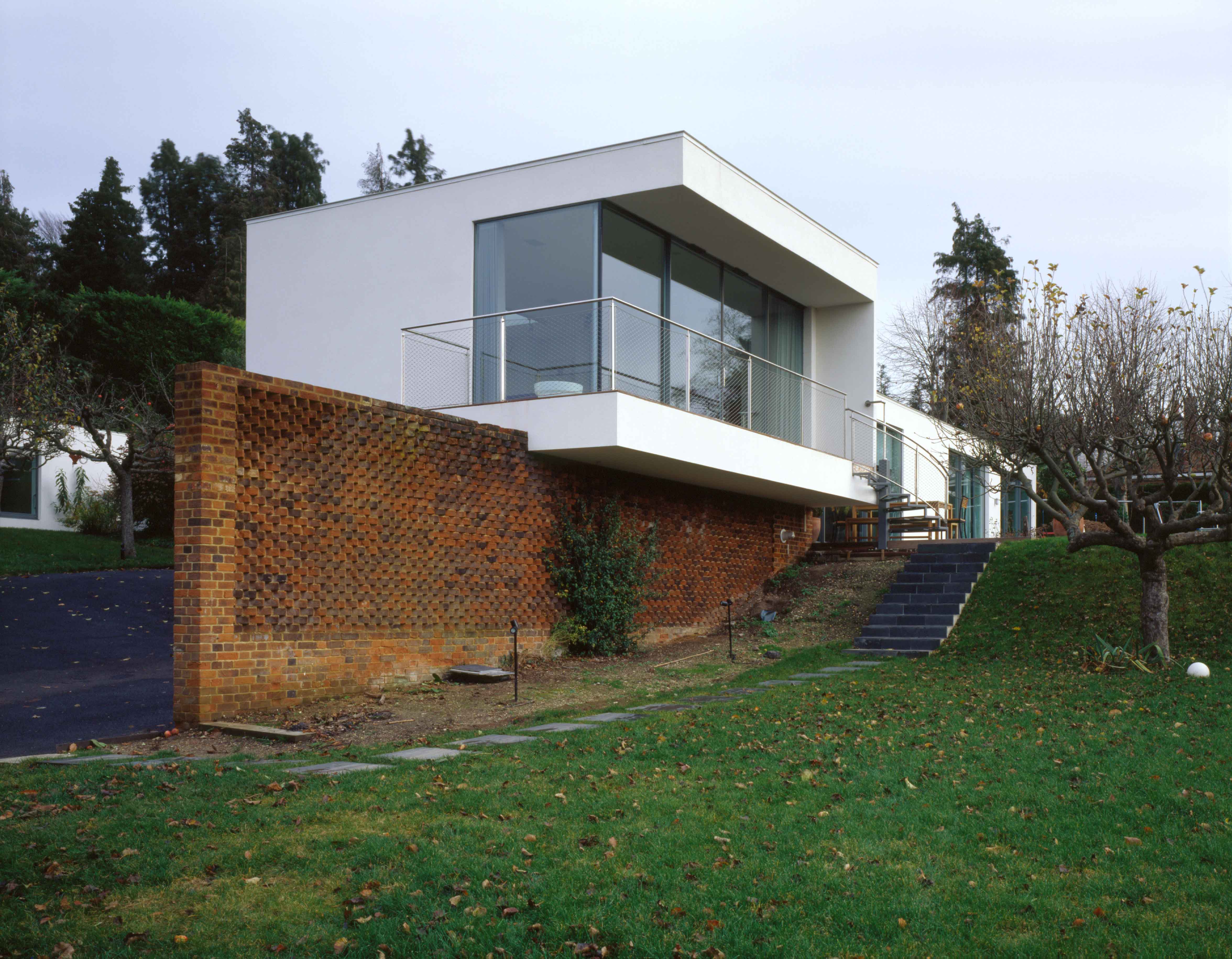 The site occupies a hillside location in Guildford with panoramic views over Guildford and the valley of the river Wey. Chantry View Road comprises a mix of traditional Surrey style houses and some Art Deco and Arts and Crafts houses. The new dwelling retains the original elevated living room ‘box’. This is set at a higher level to the rest of the house with the additional accommodation provided in the new bedroom wing which forms the new courtyard. A new study ‘pod’ partly buried into the hillside completes the courtyard enclosure. A glass hinge forms the transition between the living spaces and the bedroom wing.