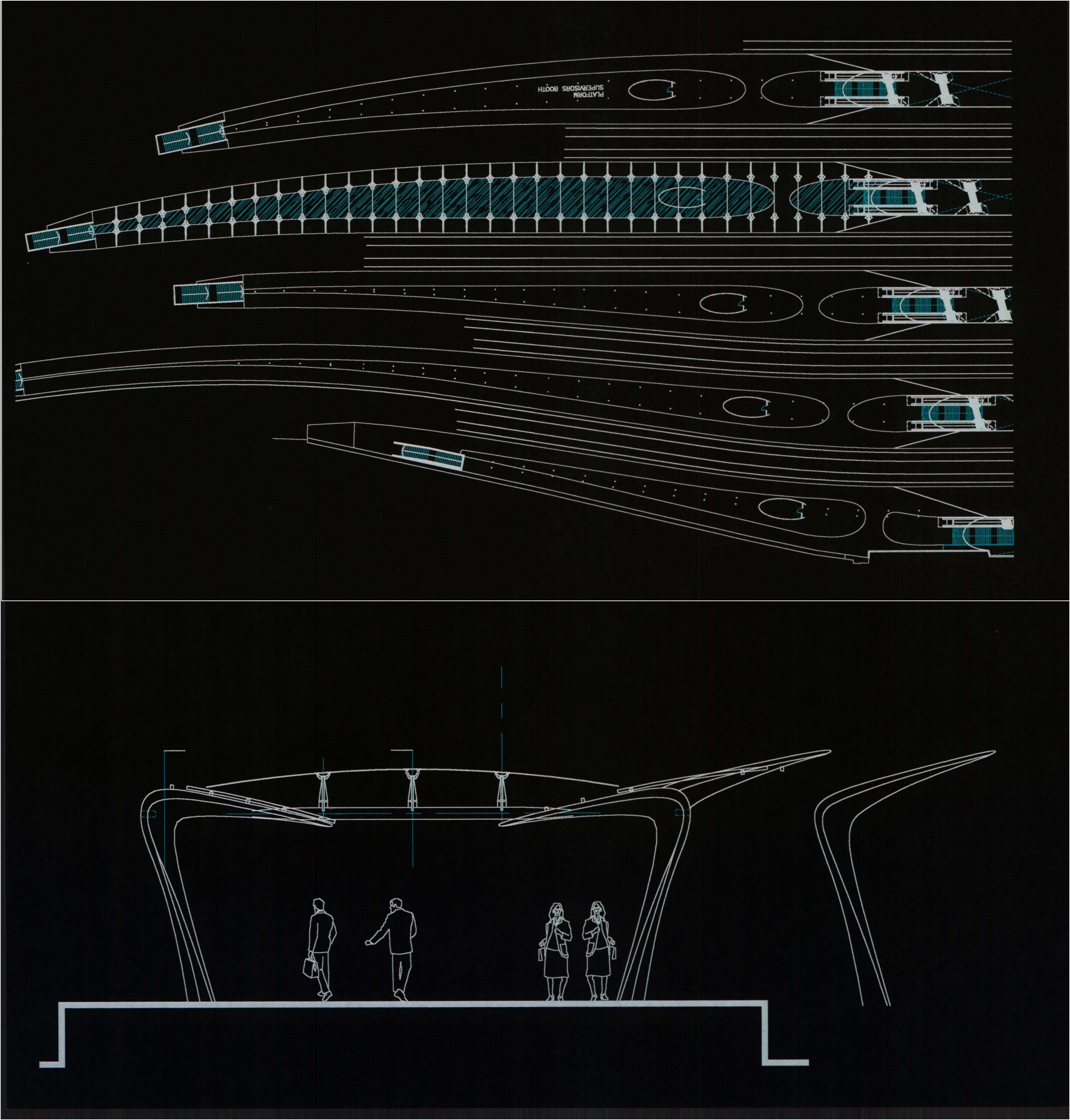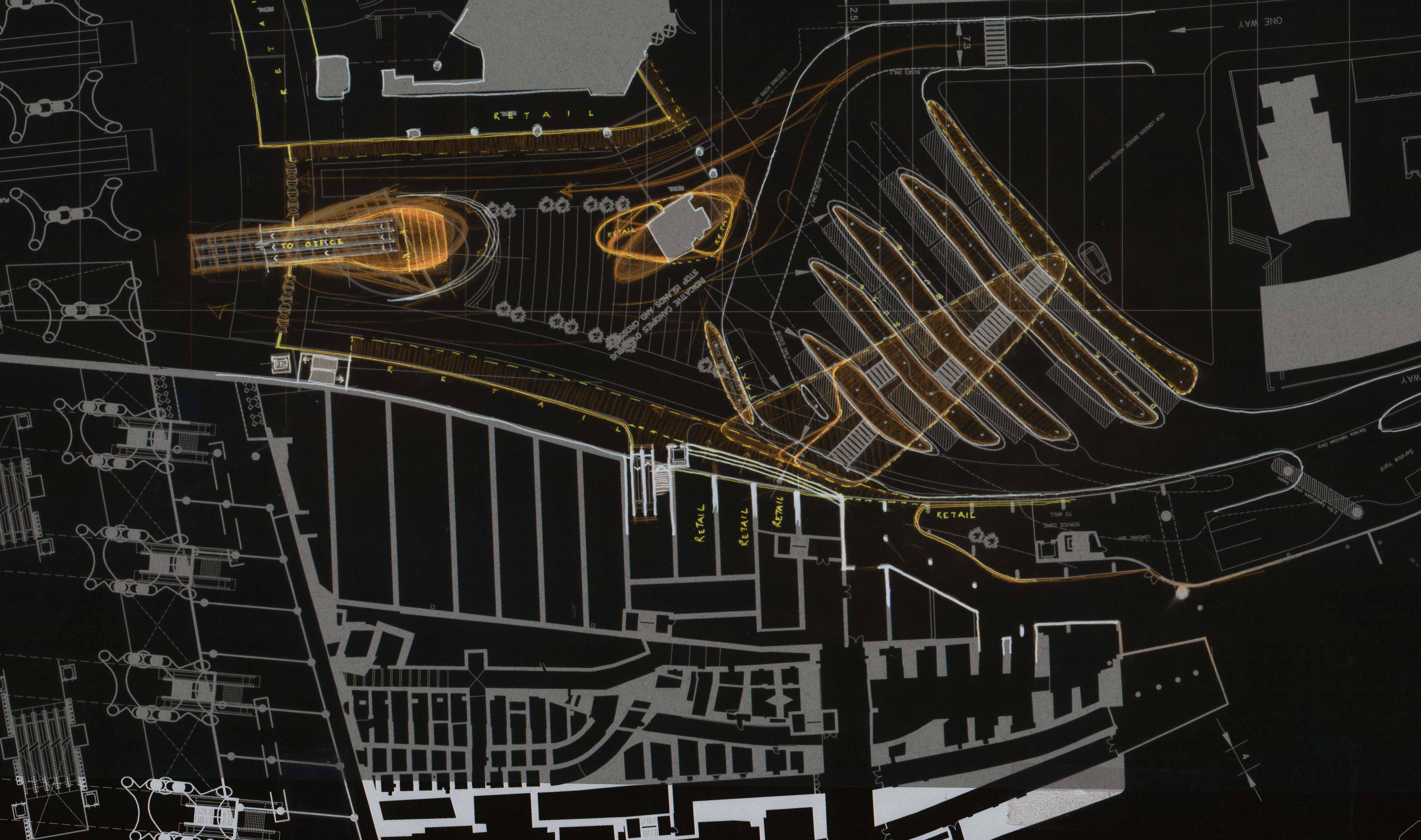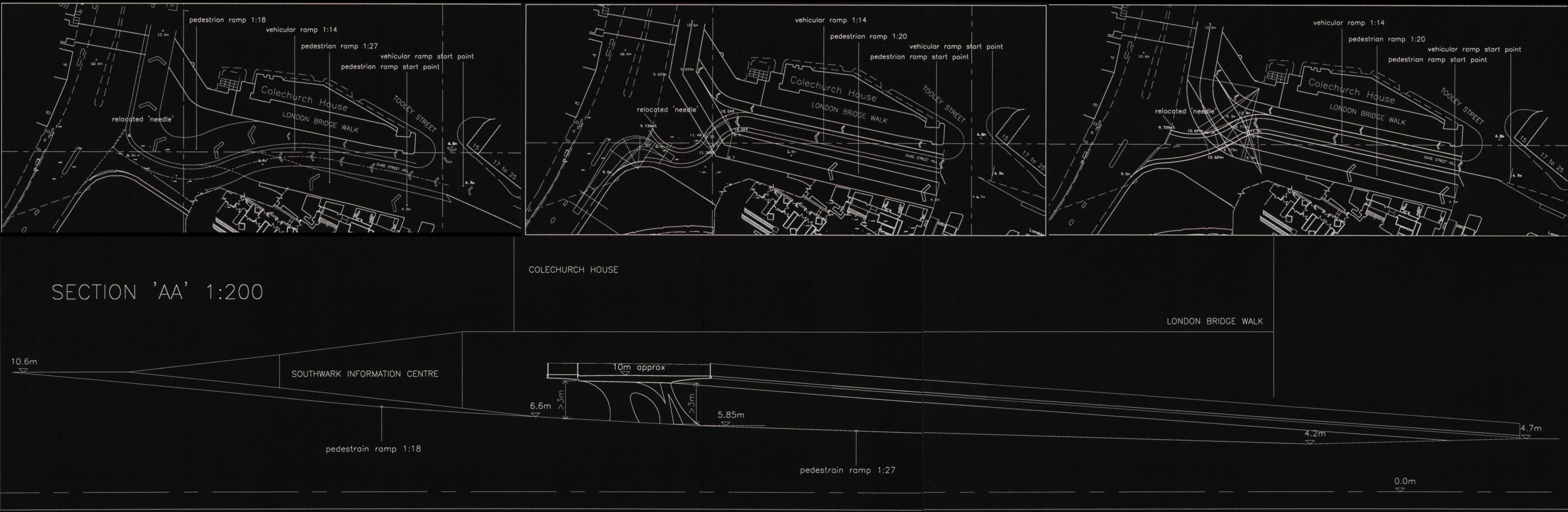 The designs needed to cater for pedestrian flows in excess of 50,000 pedestrians per hour. Diagrams below show vehicular and pedestrian movement options with section showing possible ramp layouts.