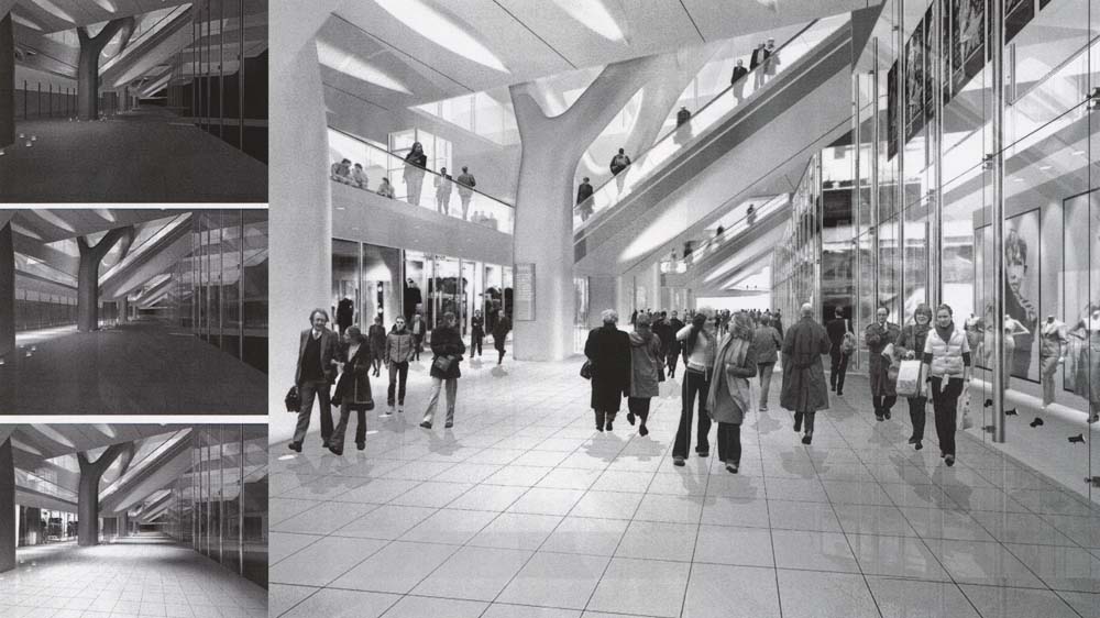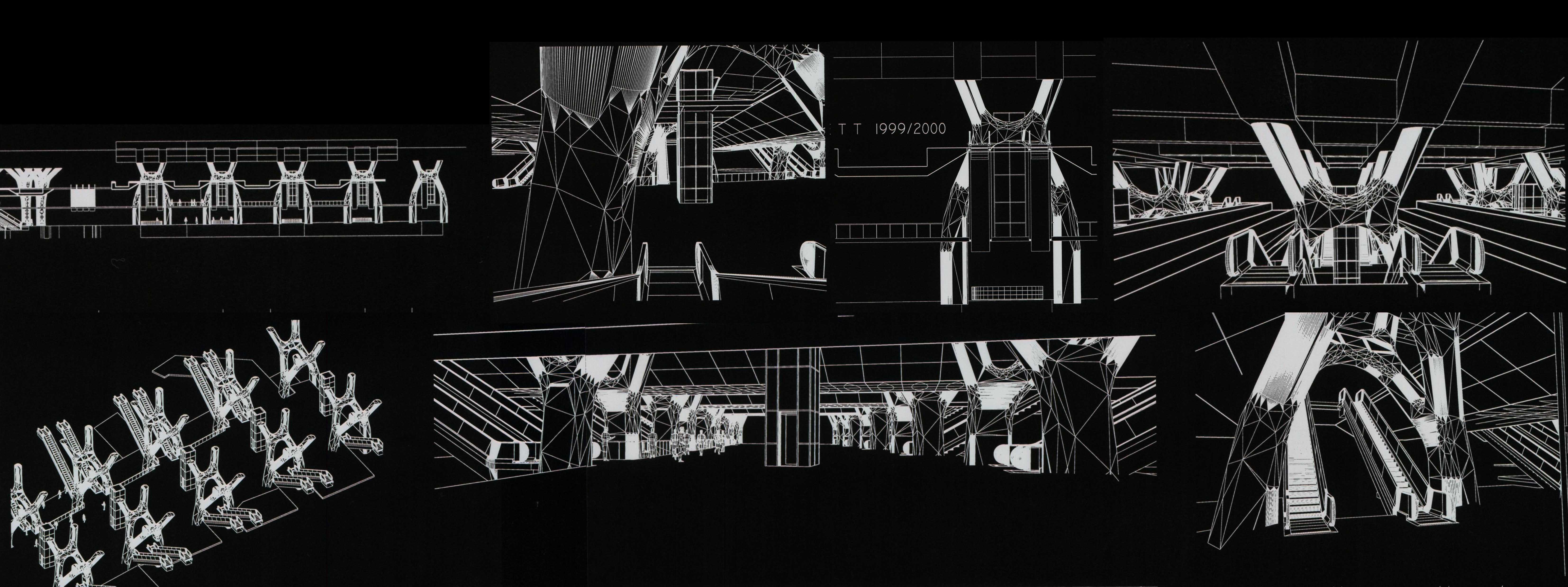 Design of 'tree' structures by Alan Baxter carrying new platforms and the air-rights building with escalator links from concourse level up to individual platforms threaded through their legs. Suraj was involved in 3d modelling of the forms and spaces.