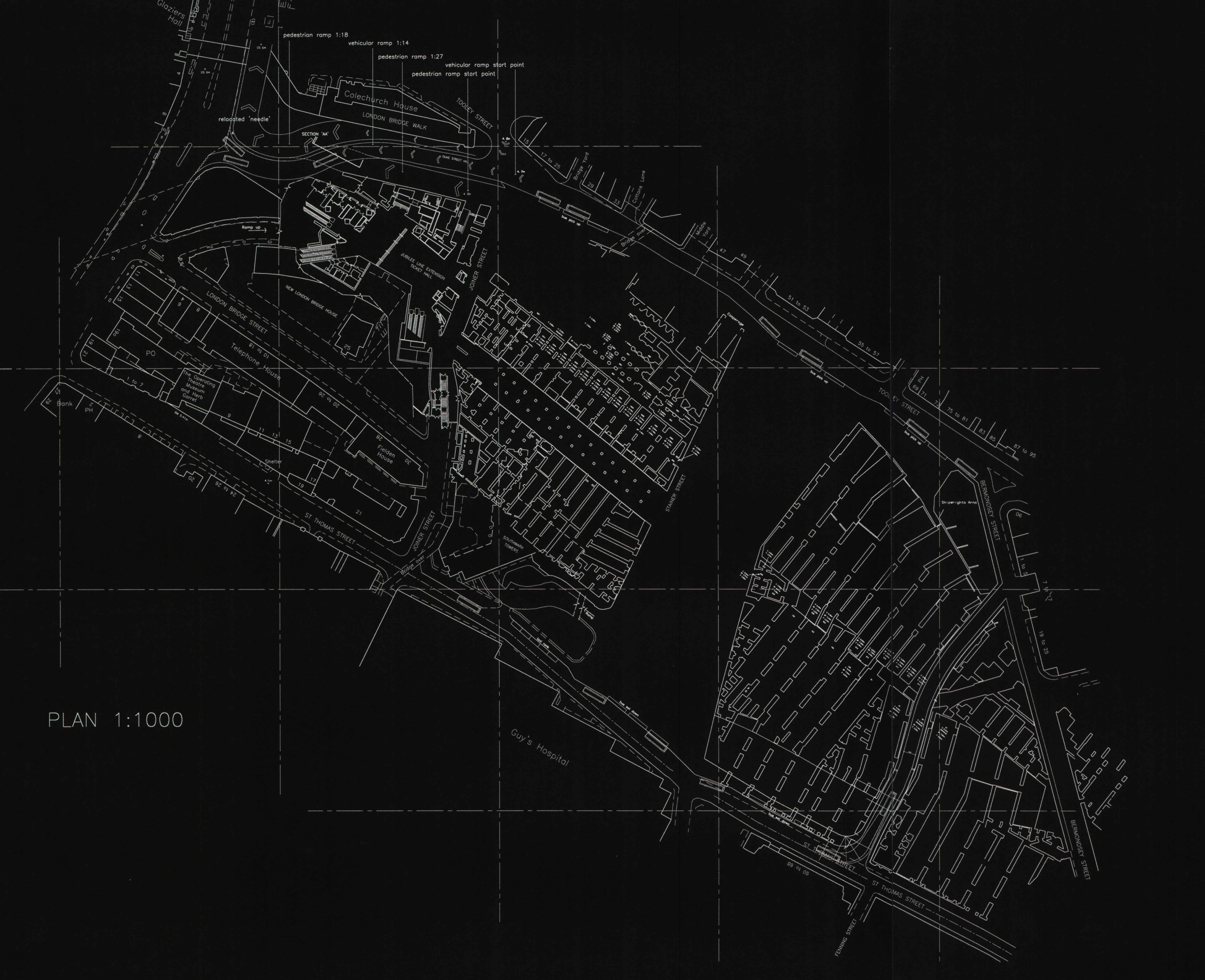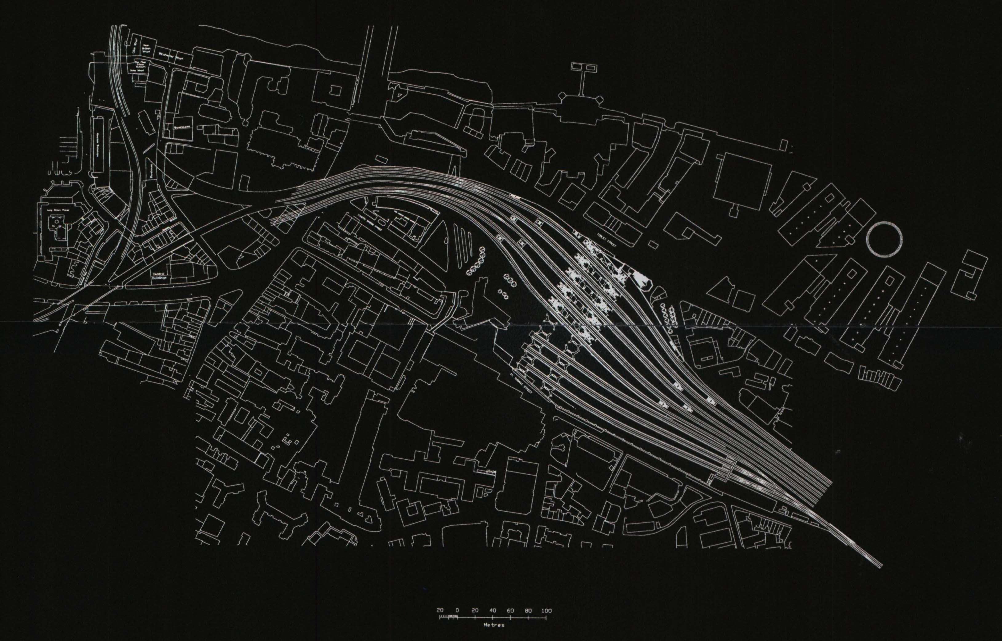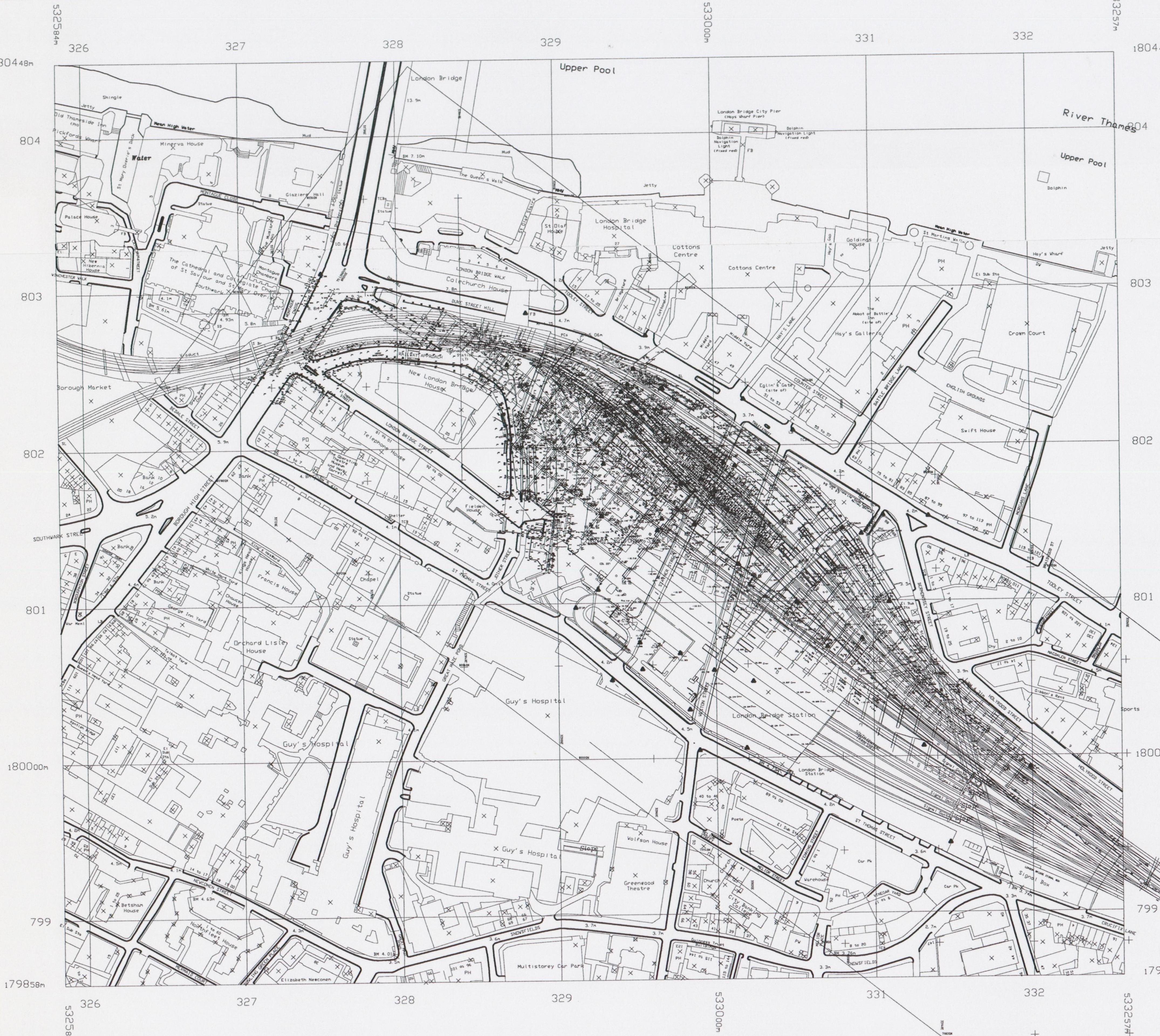 Survey of existing london bridge tracks and arches overlayed on OS map and grid.