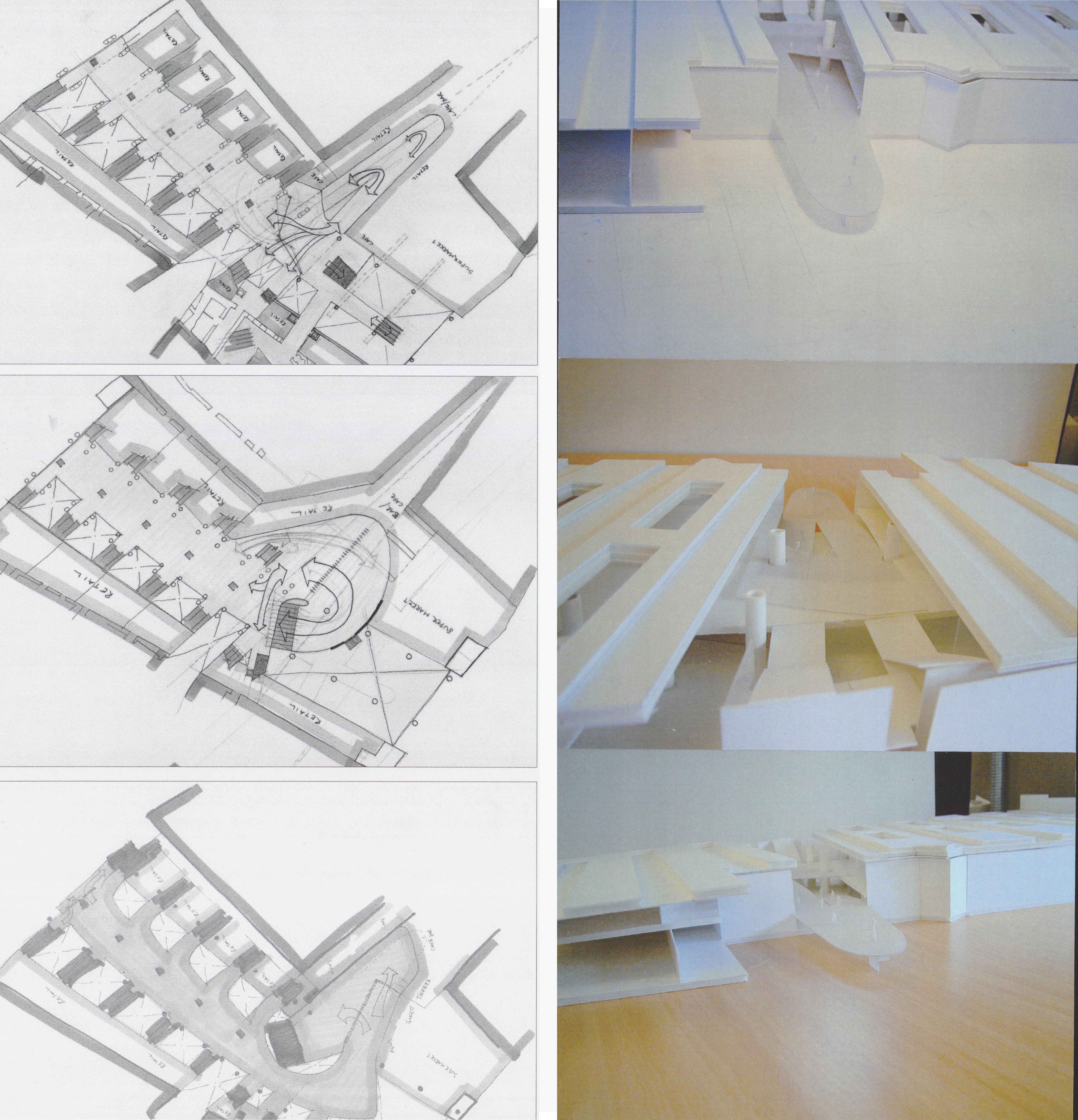 Suraj produced three concourse access options along with an air-rights building designed to take advantage of this triangular void where no platform was necessary. The model on the right is a model of the last sketch on the left. It shows how mass pedestrian movement could take place on this wide 1:15 ramp fitted within this triangular void, eliminating the need for any escalators. It would be one continuous street rising up gently to the new station concourse with retail stores flanking it all the way, and with clear daylight above.